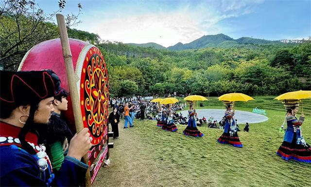 傍晚时分,悠扬的铃声准时响起,一位彝族老人手牵黑绵羊走入观众视野。当夕阳余晖洒向舞台,云雾缭绕间,舞台灯光与自然光影交织……“布拖高腔”串联起彝族古老的《朵洛荷》舞、高腔吟唱与毕摩祈福,昆曲《牡丹亭》、京剧《人间好》、彝族“戏剧活化石”《撮泰吉》、藏族《杜基嘎尔》、羌族《释比戏》同台竞演,更有月琴、口弦、羊皮鼓与交响乐交织回响,绘就一幅“赶集路上”的民俗风情长卷。