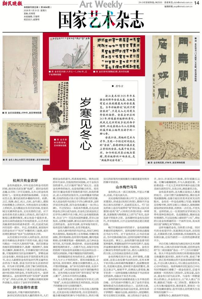浙江美术馆2025年年末推出的跨年金农大展,大概是有史以来规模最大的金农展览。当年郑板桥说“杭州只有金农好”,只是文人之间有点夸张的扬誉。金农去世后的263年,伴随着郑板桥的秀句,风风光光回到故乡杭州西子湖畔,向这座湖山与人文俱俊的城市献上他作为游子的一瓣心香。