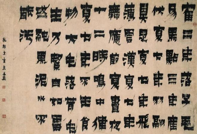他漆书的写法多多少少有点他人格的象征,尤其是长枪大戟的斜笔,往往显得凌厉,蕴含着突破的机锋与个性的张力,然而少数突兀的斜笔终究被统摄在分量更重更有秩序的横平竖直里。